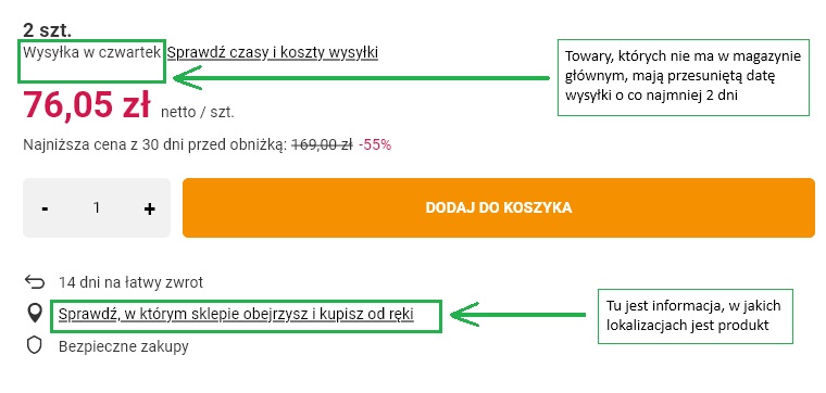 Termin wysyłki towaru podany jest nad ceną, a dostępność w lokalizacjach, poniżej przycisku dodania do koszyka.
